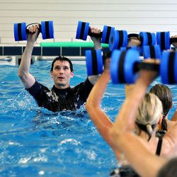 Unser Schwimm- & Fitnesskurse finden alle in kleinen Schwimmbädern statt. Nur wir sind zum Kurs im Wasser und haben keine Zuschauer.